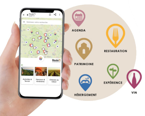 Lancée en 2019 par le département, l’application Route 71 a pour vocation de valoriser les atouts du département et de promouvoir sa richesse. Elle peut être lancée depuis un smartphone, une tablette ou encore via les bornes digitales, installées depuis 2020 dans des villages d’appellation contrôlés, les entrées des villes et les sites touristiques.