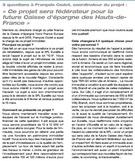 Au sein de ce projet, la future Caisse d’épargne Hauts-de-France occupera de 10 à 13 000 m2 pour l’implantation de son siège lillois. Le siège actuel de la Caisse d’épargne Nord France Europe, situé 135 Pont-de-Flandres à Euralille, est en effet devenu trop étroit pour accueillir les collaborateurs de ses fonctions dites “supports” dans des conditions optimales de travail et d’échanges. Il faut se rappeler que cet immeuble Willy Brandt avait initialement été conçu dans les années 2000 par la Caisse d’épargne de Flandre pour un effectif bien moindre que celui de la Caisse d’épargne Nord France Europe (550 collaborateurs)… Par voie de conséquence, il est également trop petit pour être l’un des deux principaux sièges de la future Caisse d’épargne Hauts-de-France.