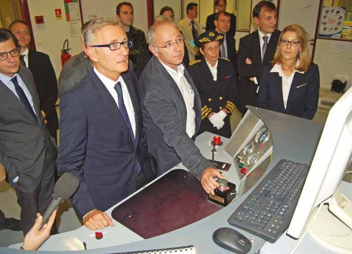 Lors de la visite à Faiveley Transport, André Vallini découvre un simulateur de conduite de locomotive.