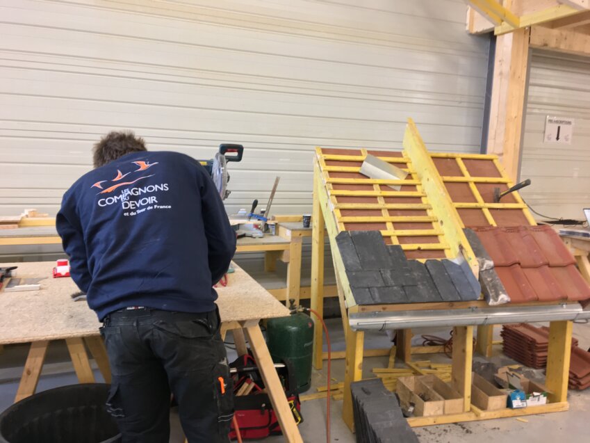 « J’ai choisi les Compagnons pour leur enseignement, la possibilité de faire un Tour de France mais aussi pour le côté humain, c’est une vraie aventure », explique Hubert Mariage, qui après un CAP Charpentier suit une formation post-bac en couverture à Lille. « J’ai trouvé ma voie », sourit-il en travaillant sur une gouttière.