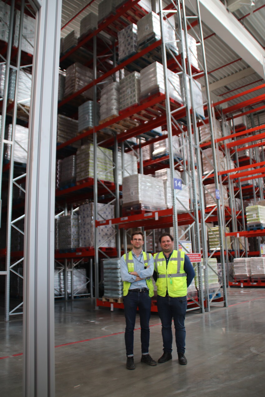 « Nous avons 66 000 emplacements pour les palettes qui sont manipulées par des remorques robotisées, capables de décharger un camion de 44 tonnes en deux minutes et 30 secondes. Ces chariots, au nombre de 35, se déplacent en toute autonomie, sans aucune intervention humaine. C’est nous qui les avons conçus, de même que les applications informatiques, avec une plate-forme de rendez-vous, un équivalent de Doctolib qui évite les embouteillages de camions sur le site. Matthieu et moi sommes notre département R&D ! Nos salariés au nombre de 100 sont recentrés sur les tâches à haute valeur ajoutée. C’est l’entreprise qui les forme sur le site, qui fonctionne 24 heures sur 24, sept jours sur sept. »