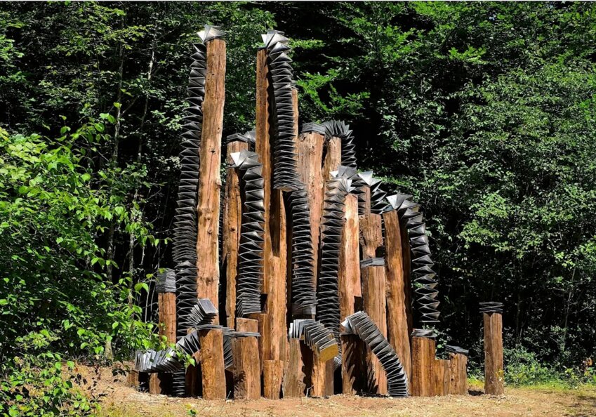 «Décloisonner, créer des ponts et nouer des partenariats», c’est la raison d’être de Pascal Yonet, le directeur artistique du Vent des Forêts, labellisé centre d’art contemporain d’intérêt national. Comme chaque année, au cœur de l’été, l’association a dévoilé les sept nouvelles œuvres, fruits de mois de créations imaginées par sept artistes venant de France, du Japon ou encore du Togo. Le visiteur peut désormais découvrir deux immenses sculptures qui s’entrelacent et sont le résultat d’un projet porté par Vincent Cardoso en partenariat avec la Casa de Velázquez, la résidence artistique de Madrid, ou encore de Léon Binetruy qui a créé à partir d’un chêne trois ruches troncs pour accueillir en lisière de forêt des colonies d’abeilles sauvages. L’artiste togolais Kokou Ferdinand Makouvia a opté pour une sculpture monumentale composée de 36 poutres de chêne coiffées de pièces en aluminium quand Masami a, elle, choisi de travailler des fils métalliques gainés de couleurs, un matériau de réemploi qui prend la forme organique de fruits après avoir récupéré des câbles via Orange. À l’antipode d’un musée classique, le centre d’art contemporain meusien a su devenir une référence culturelle, qui se tourne depuis plusieurs années vers le monde économique.