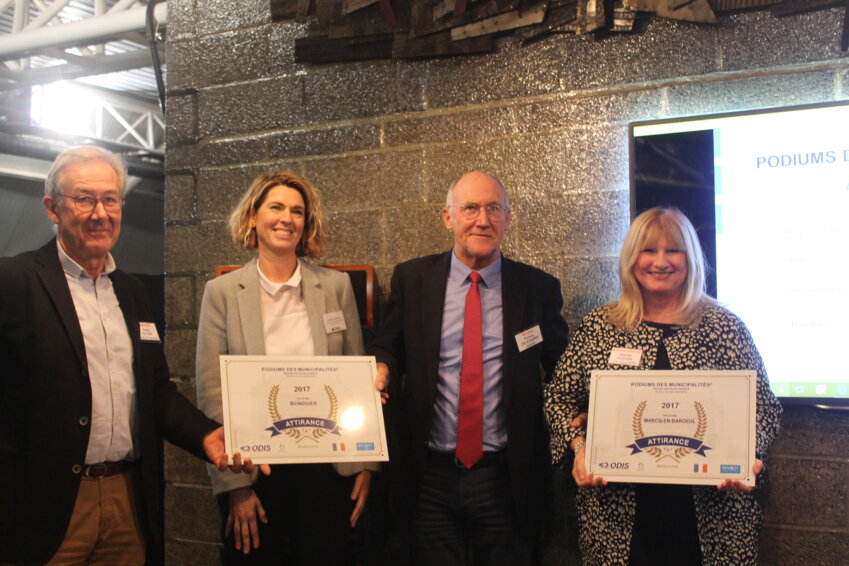 Bondues, représentée par Xavier Ruyant et Patrick Delebarre, et Marcq-en-Barœul, par Sophie Rocher, ont reçu le trophée Or en indice “Attirance” remis par Laurence le Chevalier, de la Société générale.