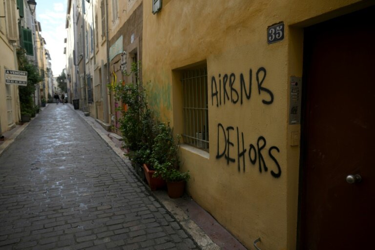 "Airbnb dehors!": le slogan en lettres noires se répète sur les façades pastel du Panier, plus vieux quartier de Marseille mais aussi, envers du décor, épicentre des locations type Airbnb, de moins en moins tolérées par des habitants confrontés au fléau du mal-logement.