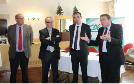 Les signataires de la convention de partenariat : de g. à dr., Bertrand Gosse de Gorre, président de Point Passerelle Nord de France, Bernard Pacory, président du Crédit agricole Nord de France, Emmanuel Landais, directeur général de l’ADIE, et François Macé, directeur général du Crédit agricole Nord de France