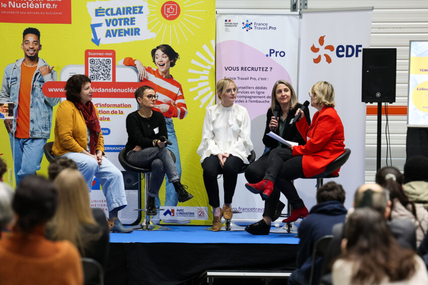 Encore trop peu de jeunes filles s’orientent ainsi vers les carrières scientifiques et technologiques qui restent l’apanage des hommes. Plusieurs femmes travaillant dans les métiers du nucléaire ont témoigné de leurs parcours et de leurs missions afin de donner à voir comment les femmes peuvent s’épanouir dans le nucléaire que ce soit dans la production d’énergie ou la défense à travers le CEA Valduc. Elles ont ainsi montré les passerelles possibles entre les métiers. « J'ai commencé avec une école d'art et je suis tombée dans l'industrie de la plasturgie où je développais des produits plastiques. Et puis au fil des ans, j'ai regardé un petit peu ce qui se passait à droite à gauche et de fil en aiguille, je suis arrivée dans le nucléaire » a par exemple souligné Andréa Burtin, ingénieure d’affaires chez ABMI.
