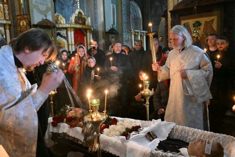 A l'intérieur de l'église de l'icône Notre-Dame "Soulage mon chagrin", située dans une banlieue calme, quelques proches se tiennent debout ou assis, en silence. Devant eux, la dépouille a été placée dans un cercueil. Le teint de son visage est cireux, des fleurs recouvrent son corps.