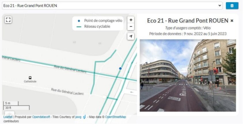 La page consacrée aux mobilités douces affiche plusieurs sections notamment une carte dynamique accompagnée d’une liste des stations permettant de sélectionner un point de comptage et d’afficher le descriptif ainsi que des graphiques pour visualiser les statistiques journalières, mensuelles, et annuelles. « L’Open Data, en permettant à toutes et tous l’accès aux informations en temps réel, est un outil essentiel de transparence et de sensibilisation. En cet été 2023 nous ouvrons une page dédiée au vélo » annoncent Nicolas Mayer-Rossignol, Maire de Rouen, Président de la Métropole Rouen Normandie, Cyrille Moreau, Vice-Président en charge des transports, des mobilités d’avenir et des modes actifs de déplacement, et Sylvie Nicq-Croizat, Vice-Présidente en charge de l’Open Data.