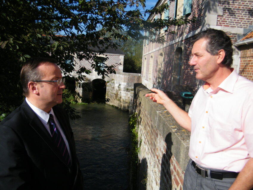 Au bord d’un ruisseau qui rejoint le marais audomarois, une ancienne bâtisse est devenue le siège de la Fédération du Pas-de-Calais pour la pêche et la protection du milieu aquatique. La visite est menée par Pascal Sailliot, président de la Fédération départementale de la pêche : «C’était la Maison du parc des caps et marais d’Opale, qui est désormais hébergée à la nouvelle Maison du marais. C’est aujourd’hui la Maison de la pêche et de la nature.» Dans l’Audomarois, on dénombre plus de 5 000 praticiens de la ligne… Une partie des bâtiments est devenue la propriété de la Fédération tandis que l’autre partie appartient à VNF. Stéphane Saint-André, à l’occasion de son tour de France des établissements de VNF, précise : «C’est VNF qui soutient le canal Seine-Nord. On a eu des coupes budgétaires mais moins que ce que prévoyait la loi de finances.»
