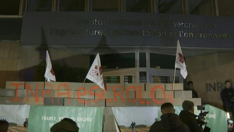 Plus d'une centaine d'agriculteurs ont érigé jeudi à l'aube un mur en parpaings pour bloquer symboliquement l'entrée de l'Inrae, l'Institut national de la recherche pour l'agriculture, l'alimentation et l'environnement, a constaté un journaliste de l'AFP.