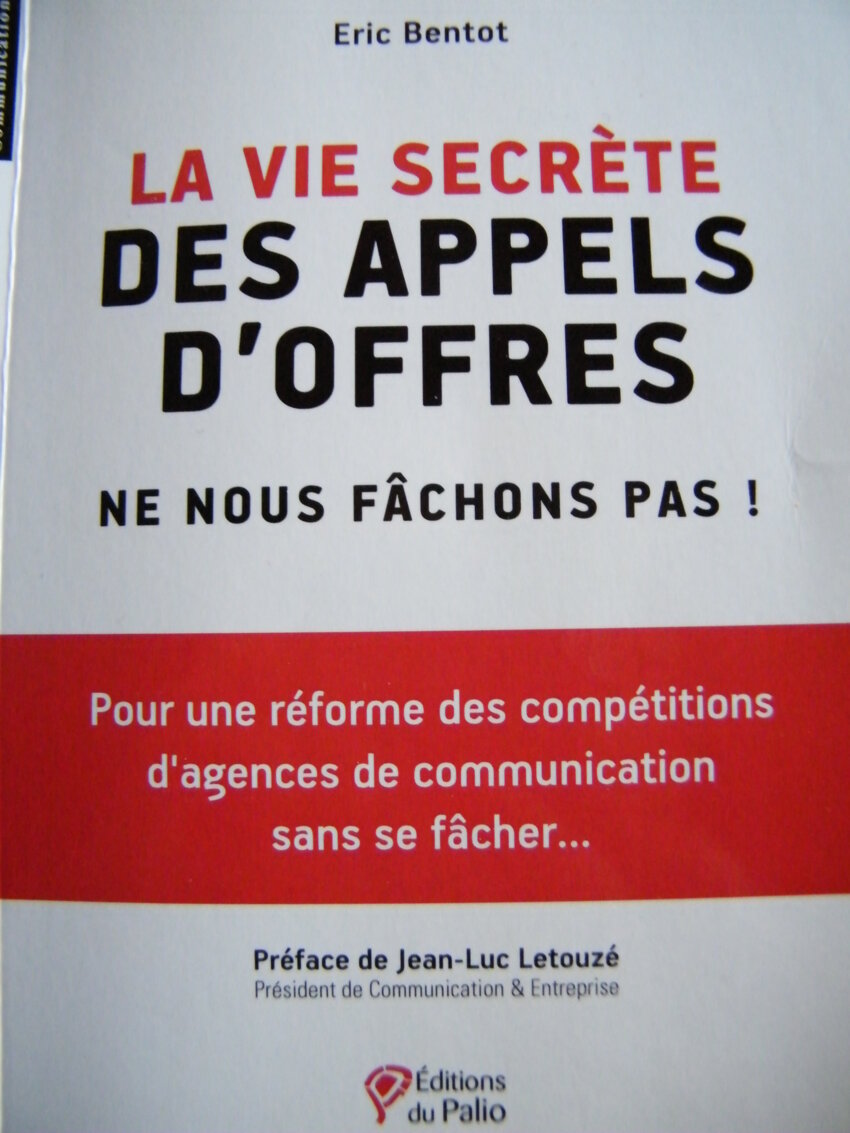 «Pour une réforme des compétitions d’agences de communication sans se fâcher…» : l’ancien journaliste Eric Bentot dresse le constat des manquements, divergences, erreurs, pratiques douteuses et autres scories qui polluent les relations entre les agences de communication et leurs clients. En 27 épisodes, il s’appuie sur des exemples concrets (où personne n’est cependant jamais cité). «Comment expliquer que ce livre se propose de parler autrement, mais très concrètement, de l’aggravation des dysfonctionnements du système concurrentiel du marché de la communication d’entreprise, et de l’inquiétante détérioration de la relation entreprise/agence qui en découle ?» L’auteur plaide ainsi pour un «choc de simplification», énumérant avec humour les acronymes avec lesquels il faut jongler pour pouvoir soumissionner : « Je suis constitué d’un RC, et des formalités DC1, DC2, DC3, DC6… Je renferme aussi un CTTP, un CCAP, CCAG, et un CCTG… Je dispose également d’un cahier des charges, d’un bordereau de prix… Je suis le dossier du marché public auquel vous avez décidé de participer.»