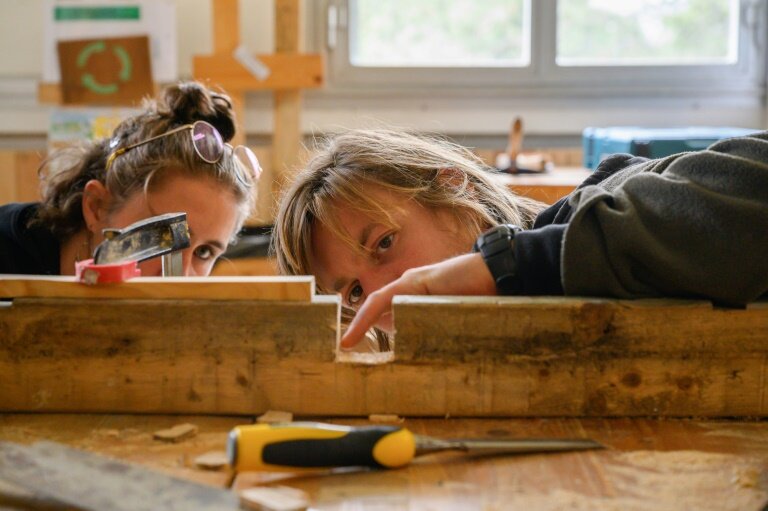 Elle propose trois formations: une "remobilisation" d'une semaine visant à découvrir les métiers de la transition écologique et à formuler un projet, une "requalification" de trois mois où les stagiaires touchent à tout, de la menuiserie au maraîchage bio, ainsi qu'un diplôme (titre professionnel) sur dix mois de menuisier agenceur en économie circulaire, avec des matériaux de récupération.