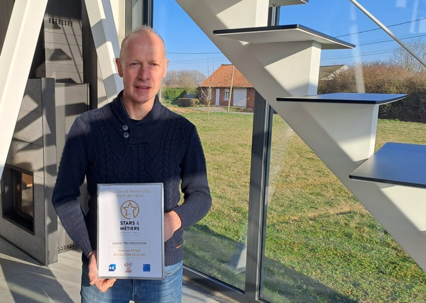 «C’est la pièce que nous vendons le plus. Nous avons même déposé un brevet d’invention en 2012… Cela nous permet d’être les seuls à fabriquer ce type d’escaliers sur 20 ans», assure l’entrepreneur. Cette capacité que Révolution Escaliers a d’innover, a séduit la chambre des métiers et de l’artisanat (CMA) des Hauts-de-France, qui a octroyé à l’entreprise un prix de l’innovation. Une fierté pour le dirigeant et ses 4 salariés.