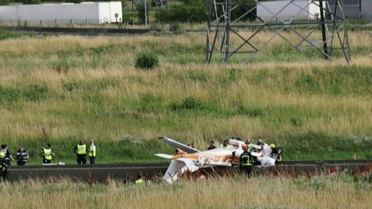 L'aéronef, un monomoteur "de type Cessna 172 (...) s'est crashé sur l'autoroute A4 après avoir, très manifestement, percuté une ligne à haute tension", a déclaré le parquet dans un communiqué diffusé dimanche soir.
