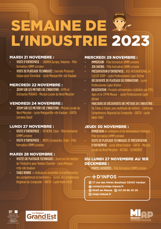 Ce rendez-vous s’adresse aux professionnels du secteur mais également aux étudiants souhaitant se plonger dans le monde de l'industrie, de l'innovation et de la technologie française. Pour ce faire, l'ensemble des partenaires (Pôle formation UIMM Lorraine, Afpa Verdun, Afpa Grand Est, Mission Locale du Nord Meusien, Pôle emploi Verdun, GRETA Lorraine OUEST, Actual Sedan…) seront à disposition du public pour toute question éventuelle. Au programme de cette journée immersive autour de l’industrie : visite de plateaux techniques des métiers de l’industrie et présentation de l'entreprise Schreiber.