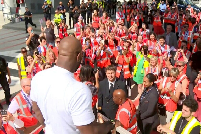 Lorsque le champion de 35 ans est apparu dans l'embrasure des portes de l'aéroport, une immense clameur a retenti, la foule criant son amour au dernier relayeur de la flamme olympique, "un modèle pour nous tous".