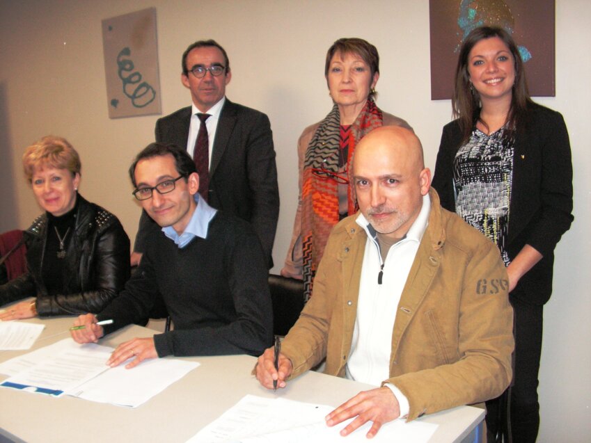 La séance de signatures. De gauche à droite : Pascale Poupart, Julien Audouard et José Lourenço, les lauréats (premier rang). Au deuxième rang : Eric Mozas (président), Jocelyne Pidoux (directrice) et Mélissa Nabais-Moreno (chargée d’étude de projets).