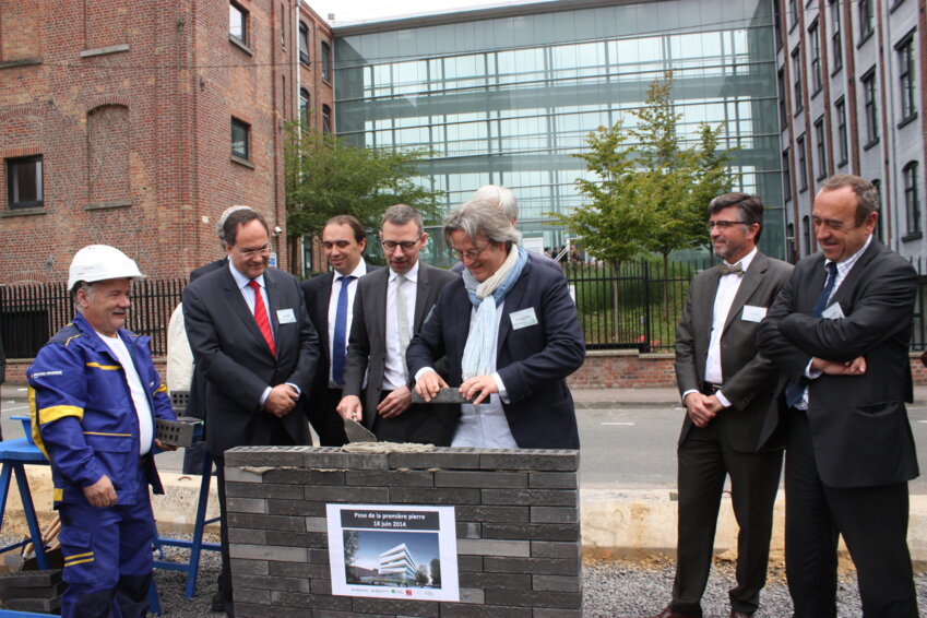 C’est en directeur général heureux d’offrir des conditions de travail optimisées, «source de gain de temps et d’échanges facilités entre eux, et d’optimisation de charges de fonctionnement pour l’entreprise», que Philippe Dumont, entouré de ses nombreux partenaires, a, le 18 juin 2014, posé la première pierre d’un nouveau bâtiment situé entre l’avenue des Nations-Unies et le 34 de la rue Emile-Moreau. Optimisation des conditions de travail, fluidification des échanges et rationalisation des coûts sont de fait les objectifs assignés par Crédit agricole Consumer Finance, n° 2 du crédit à la consommation et France, et filiale du groupe Crédit agricole, à son campus roubaisien qui doit accueillir, fin 2015, l’ensemble de ses équipes implantées dans la métropole lilloise, à l’instar des regroupements déjà effectués sur Evry (deux sites) et Arcueil en région parisienne. L’économie générée par ce regroupement est de 1,6 M€ par an pour un coût de location inférieur à celui de ses locaux actuels lillois, hors celle due à une consommation moindre en énergie et en eau par l’optimisation des surfaces et des charges locatives.