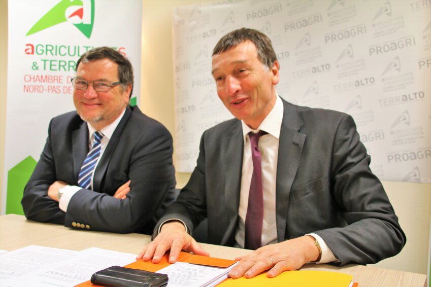 Lors de la session d’installation de la nouvelle Chambre d’agriculture du 27 février à Saint-Laurent-Blangy, Christian Durlin (à droite sur la photo) a été élu président de la Chambre interdépartementale d’agriculture du Nord-Pas de Calais. En présence de Michel Lalande, préfet du Nord, et Marc Del Grande, secrétaire général représentant le préfet du Pas-de-Calais, les 68 membres élus par les acteurs de l’agriculture et l’agroalimentaire du Nord et du Pas-de-Calais se sont réunis pour l’installation de la nouvelle assemblée, l’élection du président et du bureau ainsi que certaines désignations de commissions et représentations. Outre son président, le nouveau bureau se compose de seize membres : cinq vice-présidents (Laurent Verhaeghe, Sébastien Bocquillon, Pierre Hannebique, Nicolas Debrabant et Francine Théret), un secrétaire (Simon Ammeux) et neuf secrétaires adjoints (Christine Delefortrie, Ghislain Mascaux, Albert Lebrun, Bernard Lesne, Philippe Truffaux, Emmanuel Leveugle, Karel Lesaffre, Jérôme Muselet et Christophe Saudemont). Sébastien Bocquillon a été désigné ordonnateur suppléant et Laurent Verhaeghe (à gauche sur la photo), délégué à l’Assemblée permanente des chambres d’agriculture. Christian Durlin est membre de la chambre d’agriculture du Pas-de-Calais depuis 2007, puis de la chambre d’agriculture du Nord – Pas-de-Calais. Il est aussi administrateur de la FNSEA (Fédération nationale des syndicats d’exploitants agricoles) et président du Pôle légume région Nord à Lorgies (station expérimentale) depuis sa création en 2000. Lors de son intervention avant son élection, Christian Durlin a particulièrement mis l’accent «sur l’ambition forte pour la profession de créer de la valeur avec une vision large de cette recherche de valeur».