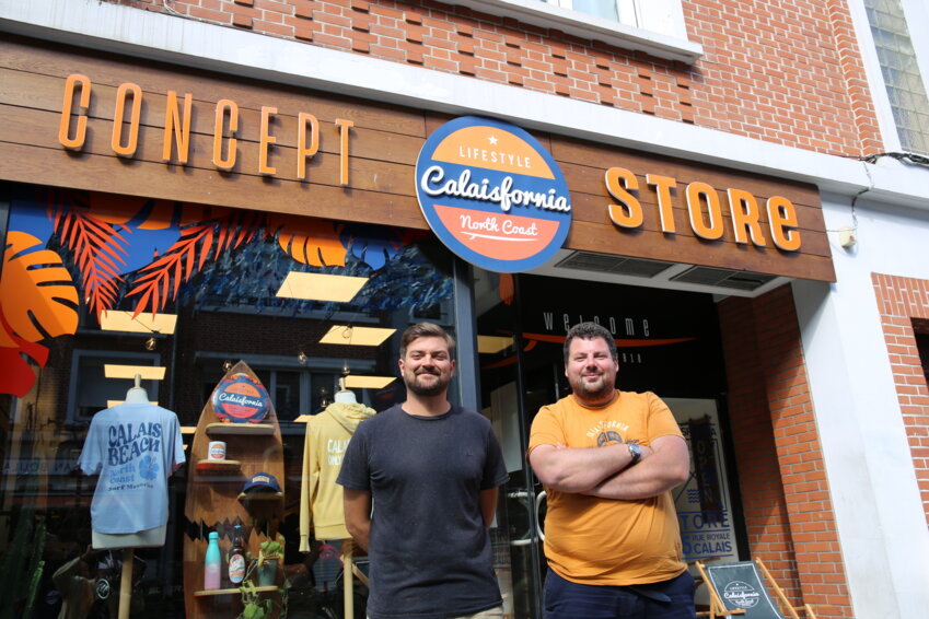 Mais que vendent-ils ? Romain Carèje et Rodolphe Leprince sont deux jeunes trentenaires calaisiens attachés à leur ville, qui ont lancé la marque «Calaisfornia». Tous deux sont drôles et avides de challenge : «Cela a commencé à un apéro» raconte le premier alors que le second sourit sur son tabouret. «Nous faisions un logo sur Calais. Nous nous sommes dit que nous le poserions bien sur un maillot, pour nous. Et puis des gens dans la rue nous ont demandé où nous l’avions acheté… Sur Snapacht, cela a commencé à tourner de plus en plus, avec un million de vues» s’amusent-ils.