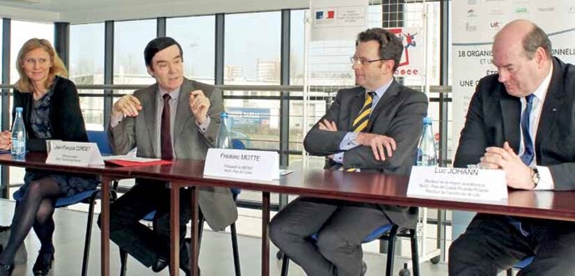 De gauche à droite, Karine Charbonnier, vice-présidente du conseil régional Hauts-de-France en charge de la formation et des relations avec les entreprises, Jean-François Cordet, préfet de la région Hauts-de-France, Frédéric Motte, président du Medef Nord – Pas-de-Calais et représentant du Groupe des fédérations industrielle (GFI) Nord – Pas-de-Calais, et Luc Johann, recteur de la région académique Hauts-de-France et de l’académie de Lille, chancelier des Universités.