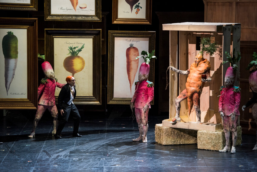L’intrigue est aussi absurde que simplissime : qu’arriverait-il si un légume accédait aux plus hautes sphères gouvernementales ? Un légume qui serait certes vitaminé, mais aussi brutal, bête et belliqueux ? Lié à Offenbach par une inoubliable Grande-Duchesse de Gérolstein, le metteur en scène Laurent Pelly rêvait depuis longtemps de mettre en scène cette “féérie potagère” – qui fut aussi “un blockbuster commercial et déjanté de l’ancien temps” : une débauche de costumes et de décors pour 195 représentations triomphales à la création ! Le public assistera ainsi à un ballet d’insectes, frémira devant une armée de navets, betteraves et radis roses, contemplera les ruines de Pompéi (façon 1870), admirera une princesse intrépide… Et plus encore, nous avertit Laurent Pelly : “À partir du moment où une carotte sort de terre pour prendre le pouvoir, tout devient vraiment possible”. Pour donner des couleurs contemporaines à cette dinguerie botanique, la dramaturge Agathe Mélinand est allée chercher “du côté de Mel Brooks, Harry Potter ou David Cronenberg”, et signe une adaptation fidèle au caractère loufoque du livret, à la fois intrigue politique, suspens et conte de fées.