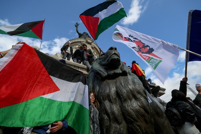 "Israël assassin, Macron complice", "pas de paix sans décolonisation": les participants à ce rassemblement organisé place de la République ont multiplié les slogans pro-palestiniens à l'occasion de cette première manifestation parisienne à ne pas avoir initialement fait l'objet d'une interdiction par la préfecture de police de Paris.
