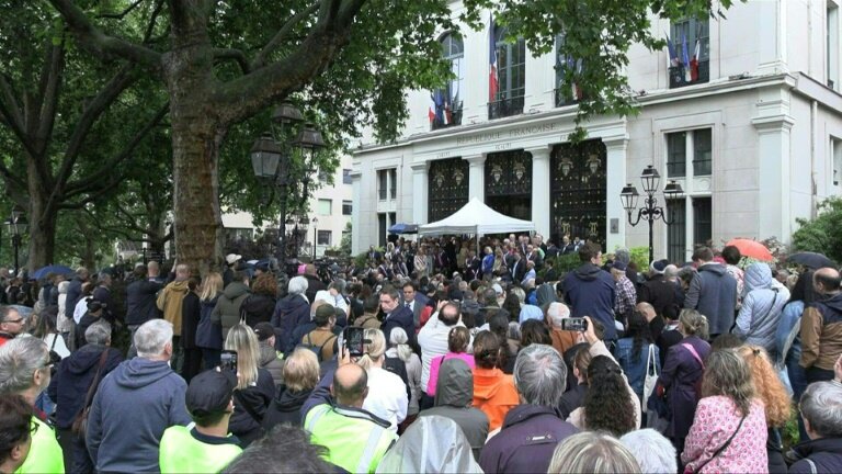 Plusieurs personnalités politiques, dont la porte-parole du gouvernement Prisca Thevenot et la présidente de la région Ile-de-France Valérie Pécresse, ont participé sous la pluie à ce rassemblement, organisé à l'appel du maire de cette commune des Hauts-de-Seine, Jacques Kossowski.