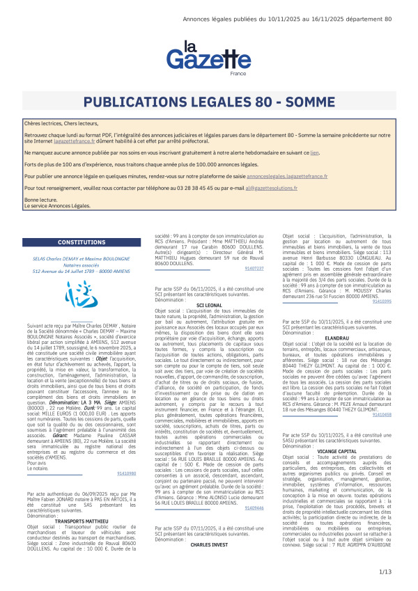 Annonces légales publiées du 10/11/2025 au 16/11/2025