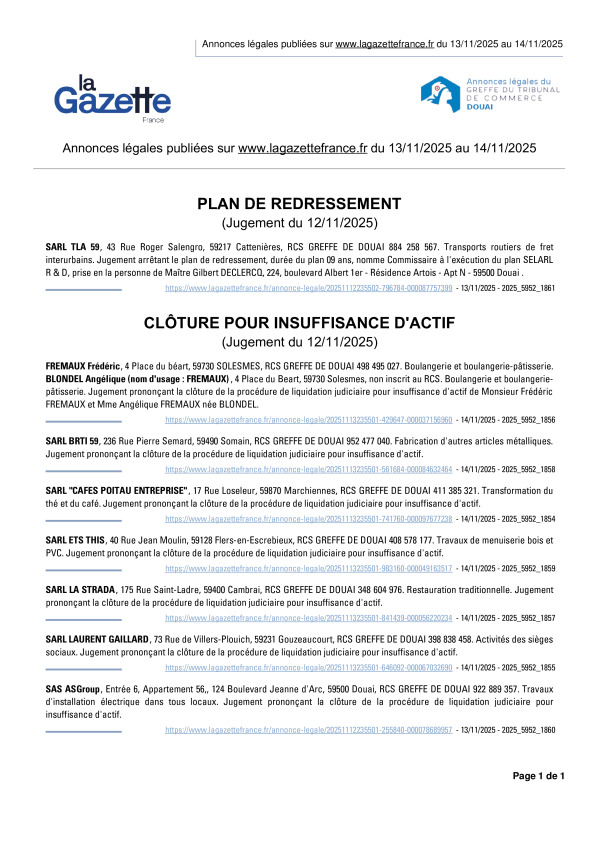 Annonces légales publiées du 13/11/2025 au 14/11/2025