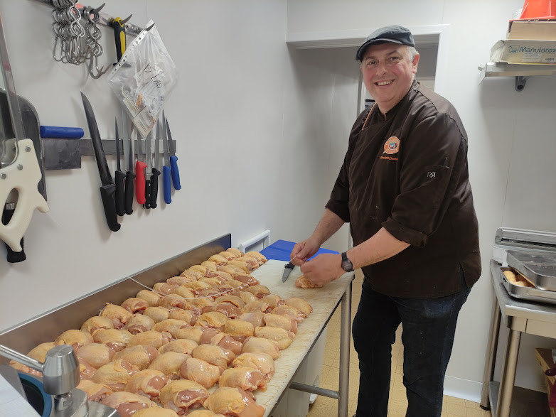 L'artisan boucher-charcutier-traiteur ici à la préparation des suprêmes de volailles pour un repas des aînés.